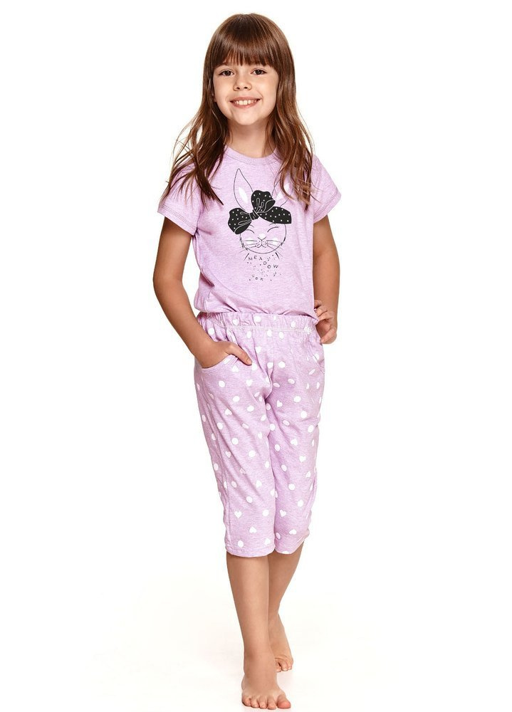 Piżama dziewczęca wykonana  z wysokiej jakości wyjątkowo miłej i miękkiej bawełny. Koszulka z krótkim rękawem oraz ozdobnym kolorowym nadrukiem .Do kompletu sppodnie typu rybaczki z wygodnymi kieszeniami