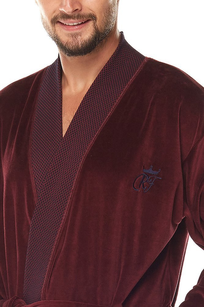 Welurowy szlafrok męski. Długi, z szalowym kołnierzem, wiązany w pasie. Na wysokości bioder dwie kieszenie. Mankiety, kołnierz i kieszenie wykończone wzorzystą dzianiną. Na wysokości klatki piersiowej mała aplikacja.