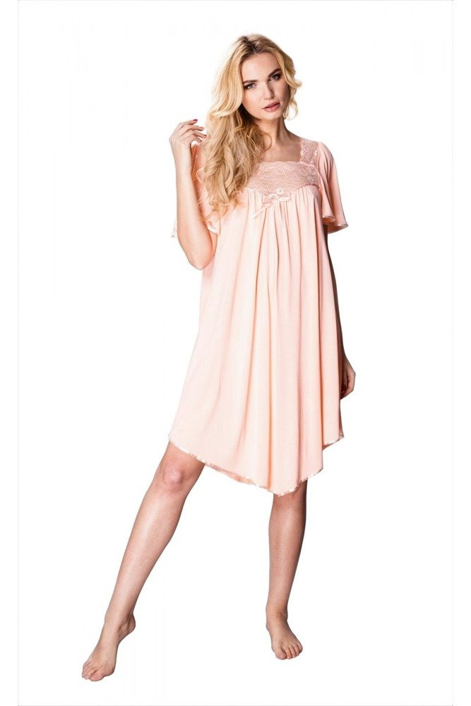 Koszula nocna wykonana ze zdrowego jedwabiu wiskozowego z krótkim rękawem i asymetrycznym dołem. Zdobiona jest koronkowym karczkiem i satynowymi obszyciami, które podkreślają elegancję, a zarazem prostotę tej koszuli. Wspaniała koszula nocna, w której na pewno poczujesz się modnie i elegancko.