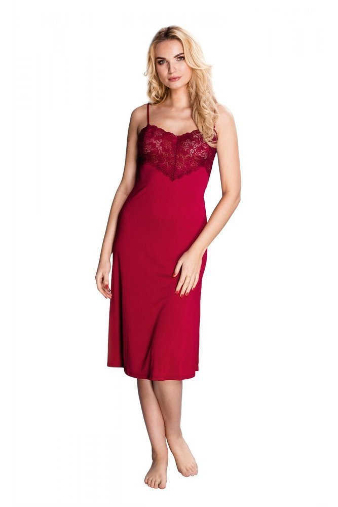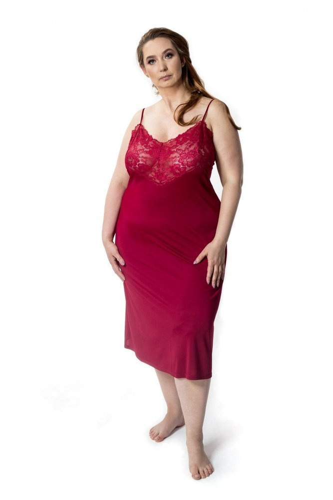 Koszula nocna o długości “midi”, wykonana z lekkiej dzianiny wiskozowej oraz kobiecej koronki, która nadaje jej eleganckiego charakteru. Góra koszuli uszyta z elastycznej koronki w kształcie ponętnego karczku, z głębokim dekoltem, na cienkich, regulowanych ramiączkach. Dół prosty, lekko dopasowany do sylwetki, co czyni ją jeszcze bardziej elegancką.