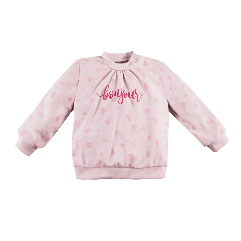 Elementem ozdobnym jest napis na bluzeczce oraz urocze marszczenie przy szyjce.