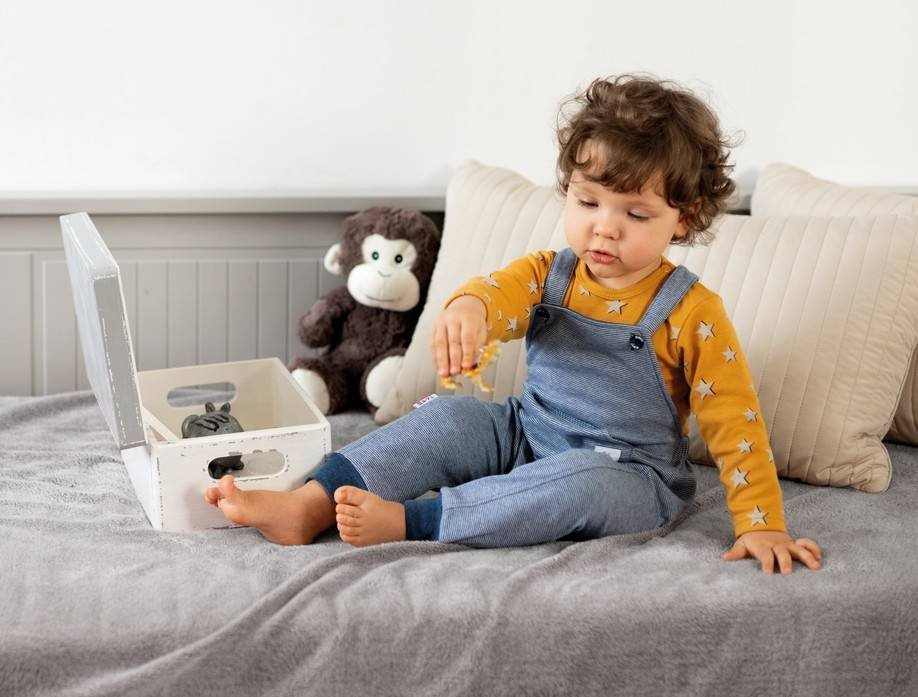 Uszyte z miękkiej i przyjemnej w dotyku tkaniny, z przodu ogrodniczek kieszonka.