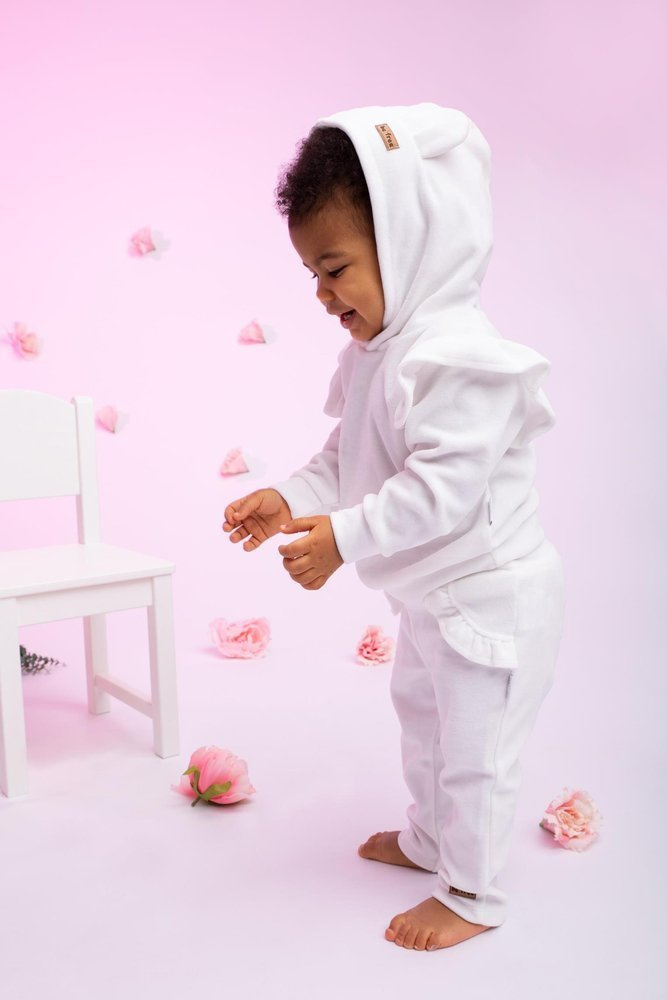 Zestaw welurowy, który składa się z bluzy i spodni. Bluza posiada kaptur z uszkami, zakładana jest przez głowę. Zdobią ją falbanki przy rękawach. Spodnie są zwężane, imitacje kieszonek tworzą również falbanki, które zostały specjalnie pomarszczone.