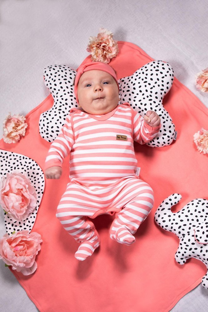 Komfortowe śpioszki dla dziewczynki w kolorze białym w koralowe paski, posiadają ramiączka zapinane na napy, co sprawia że ubranko nie będzie się zsuwało. Śpioszki uszyto z bawełny wysokiej jakości posiadającej certyfikat Oeko-Tex Standard 100 Tekstylia godne zaufania. Produkt zdobi ozdobna skórka.