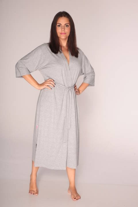 Wygodny, długi szlafrok damski. Wykonany z wysokiej jakości materiału wiskozy z dodatkiem lycry. Daje poczucie komfortu i swobody. Model z praktycznym wiązaniem w pasie. Rękawy 3/4, na szwie delikatny rozporek.