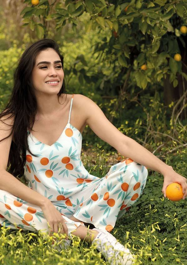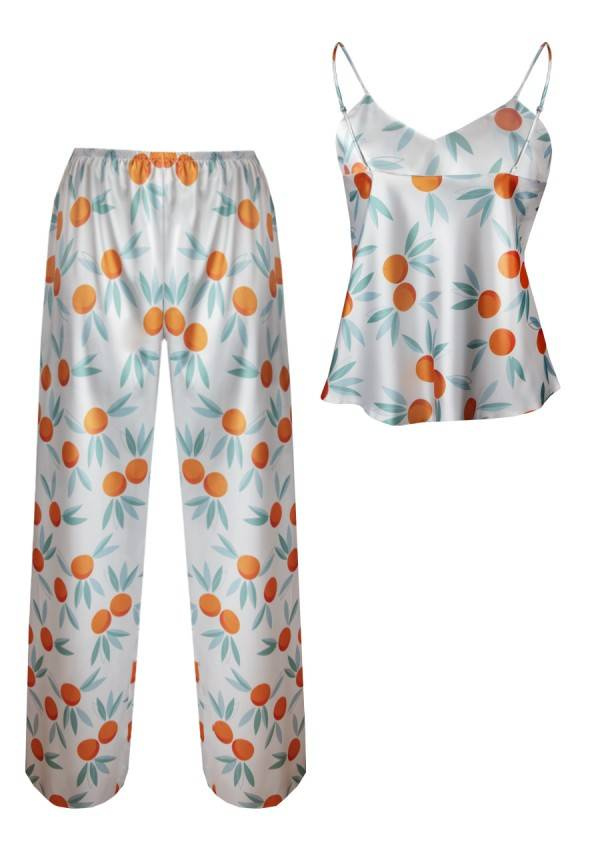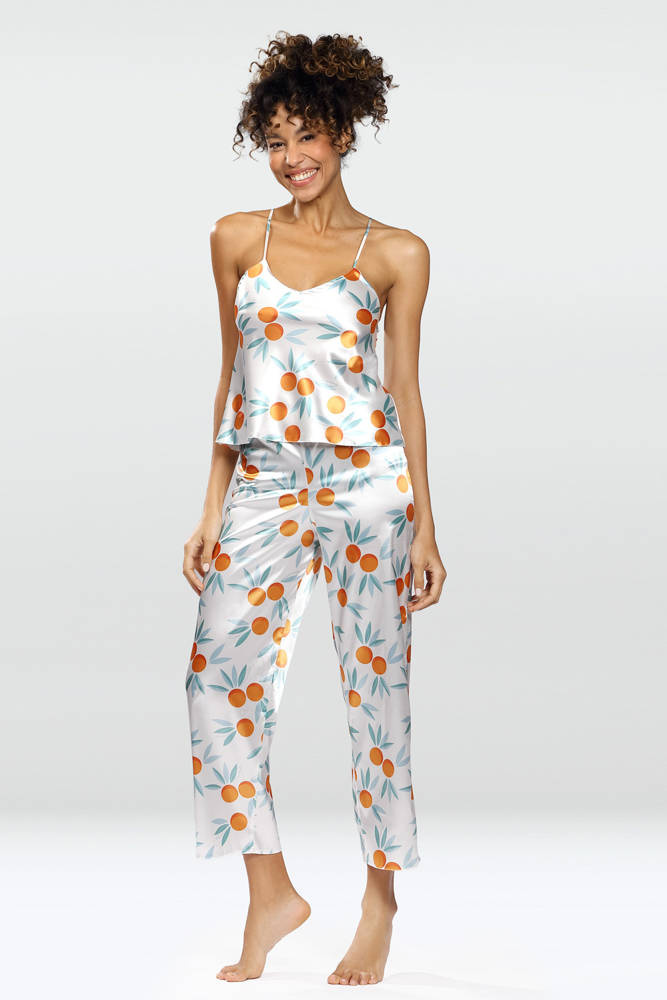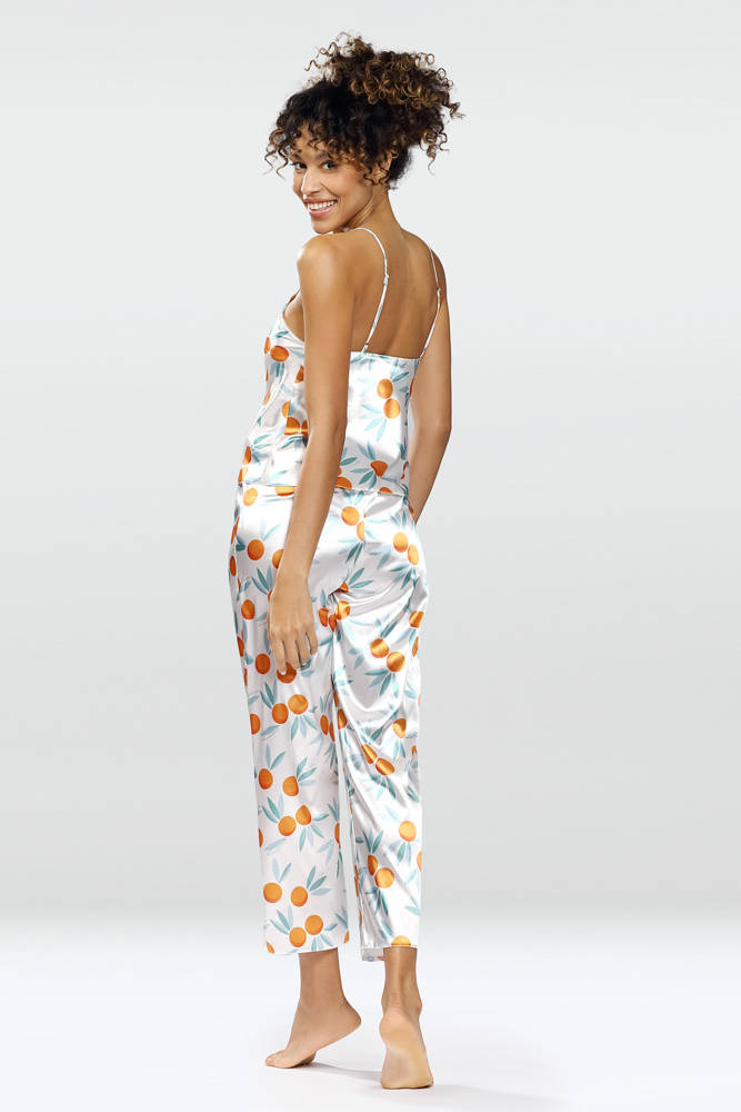 Prosty, zmysłowy dwuczęściowy komplet składający się z koszulki oraz długich spodni. Odważny dekolt w kształcie litery „V”, który jest niezwykle kuszący. Góra koszulki wykonana z drukowanej wzorzystej satyny. Wąskie ramiączka z regulacją zapewnią Tobie poczucie komfortu podczas snu. Spodnie proste, długie satynowe na cienkiej gumce dodające elegancji