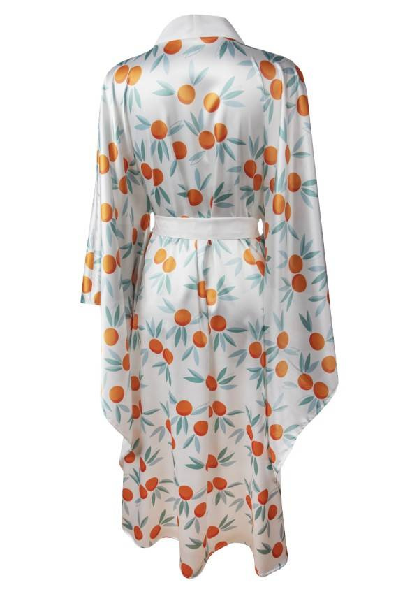 Podomka posiada długie, szerokie rękawy. Przód sięga mniej więcej do połowy ud, natomiast tył ciągnie się aż do połowy łydek. Dodatkowo, wyjątkowość podomki podkreśla jej print - na białym materiale umieszczone są zielone, tropikalne liście.
