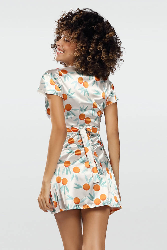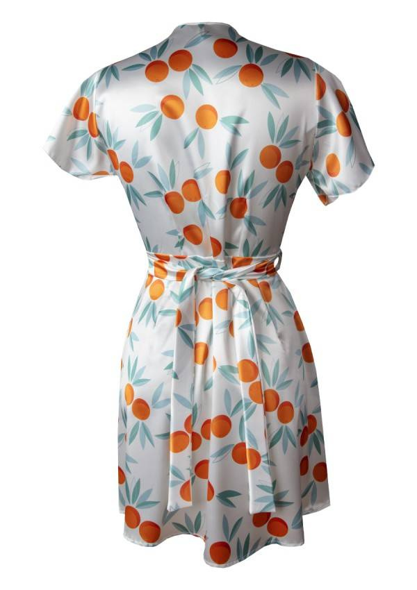 Szlafroczek - idealny na długie, leniwe poranki, ale również doskonale sprawdzi się jako wygodna narzutka na plaży. Podomka Andrea przywodzi na myśl słońce i wakacje! Wszystko to sprawia jej kolorowy, radosny print. Na satynowym materiale, z którego uszyta jest podomka, można ujrzeć pomarańcze , zielone listki. Niewątpliwie nadruk ten kojarzy się z ciepłem, latem i pysznymi pomarańczami.