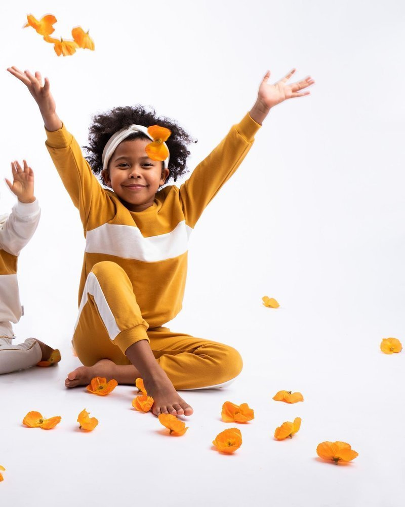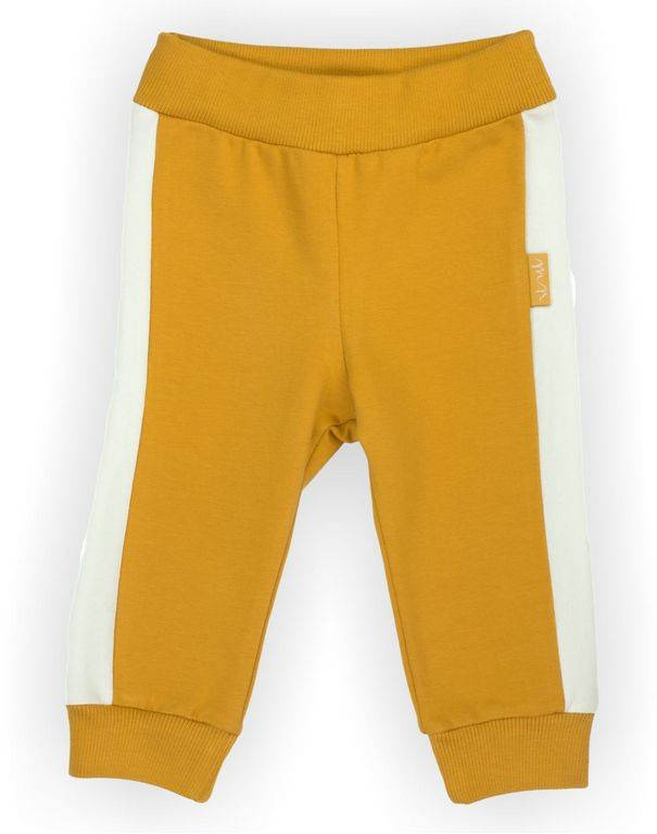 Spodnie uszyte z musztardowej bawełny dresowej z domieszką elastanu, co powoduje, że materiał nie odkształca się, a zarazem jest miły w dotyku. W pasie posiadają wygodną gumkę nie uciskającą brzuszka. Ubranko zdobią kremowe lampasy, które zostały wszyte po bokach. Nogawki zostały zakończone ściągaczami pod kolor.