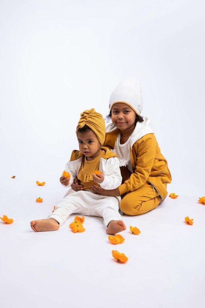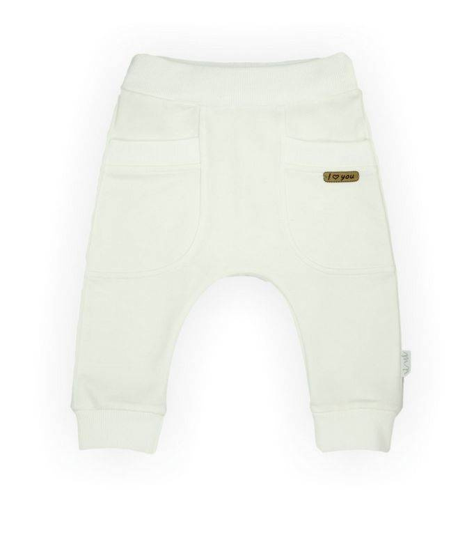 Modne spodnie dresowe dla dziewczynki typu baggy, wykonane z kremowej bawełny, z niewielką domieszką elastanu co sprawia, że materiał nie odkształca się. Spodnie posiadają ściągacz w pasie oraz przy nogawkach. Przód ubranka zdobią kieszonki oraz skórka.