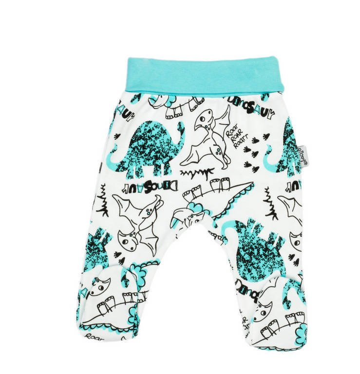 Wygodne i miękkie półśpioszki, uszyte ze 100% przewiewnej, białej bawełny z motywem dinozaurów. Wysoka jakość materiału została potwierdzona certyfikatem Oeko-Tex Standard 100 Tekstylia godne zaufania. Półśpioszki mają luźny fason i lekko obniżony stan by pomieścić pieluszkę, posiadają szeroki, bezuciskowy ściągacz w pasie w kolorze turkusowym, zapewniający pełny komfort maluszkowi.