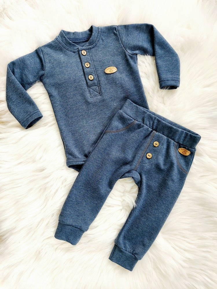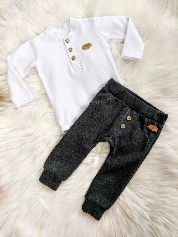 Modne spodnie dla chłopca wykonane z bawełny 100%, która jest całkowicie bezpieczna dla skóry dziecka. Spodnie posiadają ściągacz w pasie z wszytym ozdobnym sznureczkiem. Model zdobią guziki.