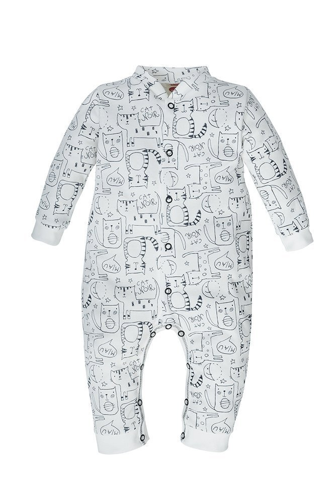 Wygodny pajac z wysokiej jakości bawełny w kolorze białym w uroczy wzór kotków. Rozpinany na całej długości, co umożliwia łatwe i szybkie ubieranie dziecka. Zapewnia swobodę użytkowania i nie krepuje ruchów dziecka. To idealne rozwiązanie dla młodych, początkujących rodziców. Dostępny w rozmiarach 68-92. Uszyty z wysokiej jakości materiały bawełnianego.