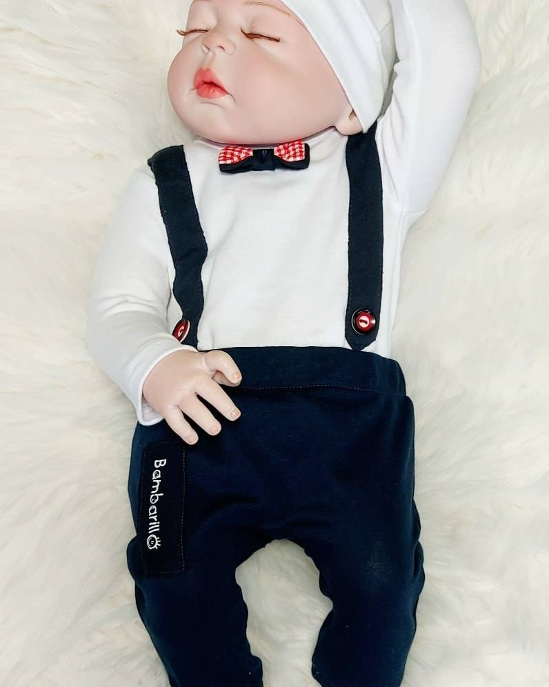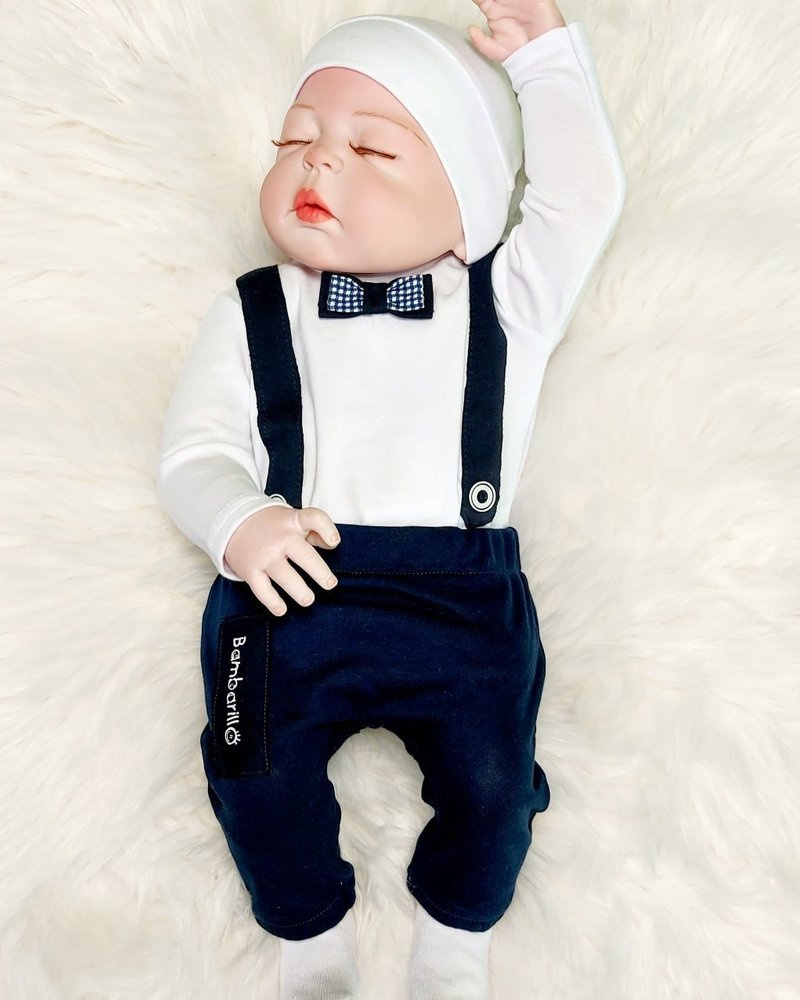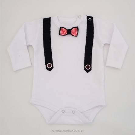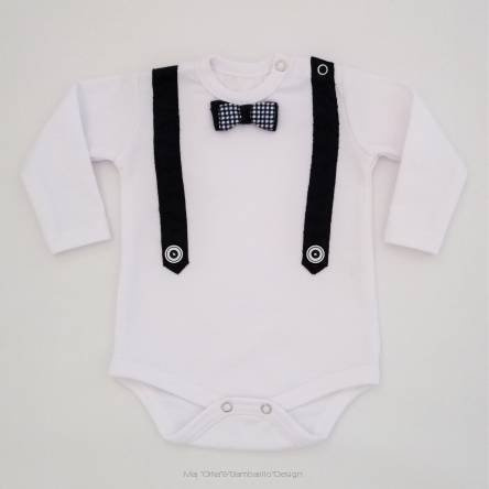 Niezwykle praktyczne i wygodne body, które zdobią szelki z guziczkami oraz podwójna muszka. Wykonane z mięciutkiej bawełny.