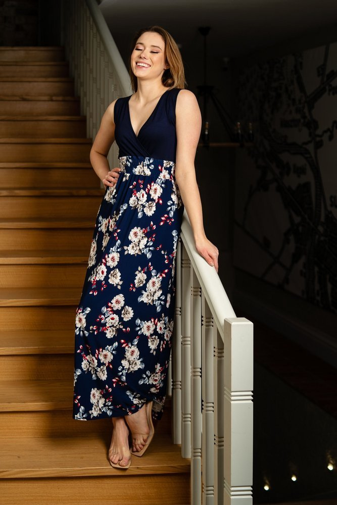 Długa zwiewna sukienka z pięknym kwiecistym motywem idealna dla przyszłych i obecnych mam. Wstawka karmiąca pozwala na dyskretne karmienie piersią a luźny krój daję swobodę i sprawia, ze sukienka nie opina się na ciążowym brzuszku .
