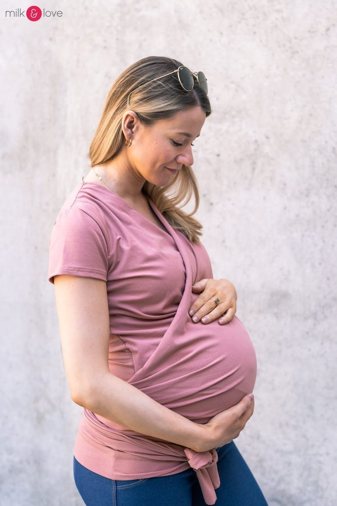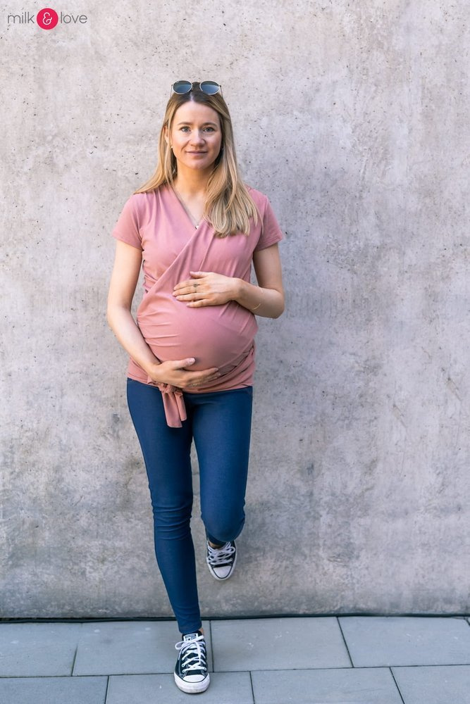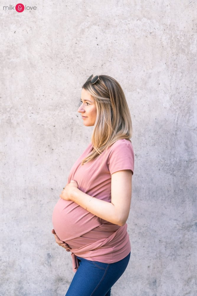 Cały czas podtrzymując dziecko jedną ręką, drugą ręką dopasuj pierwszą połę koszulki. Zmień ręce i dopasuj drugą połę. Cały czas siedząc skrzyżuj poły z tyłu i zawiąż je mocno z przodu, pod dzieckiem.