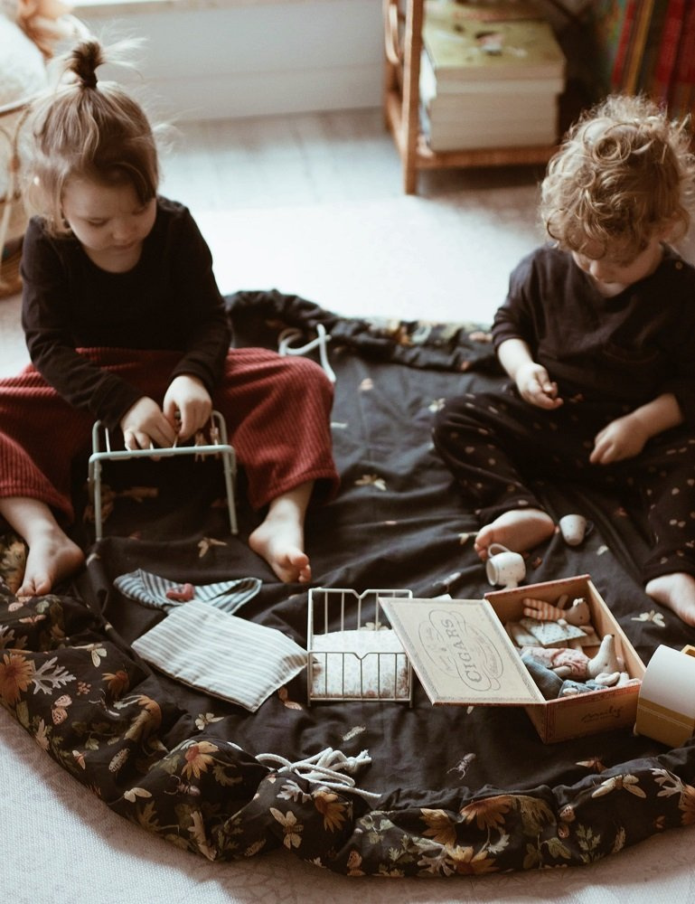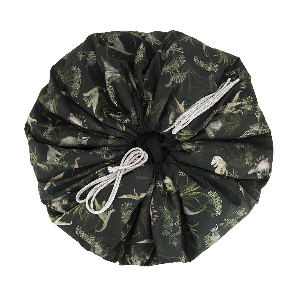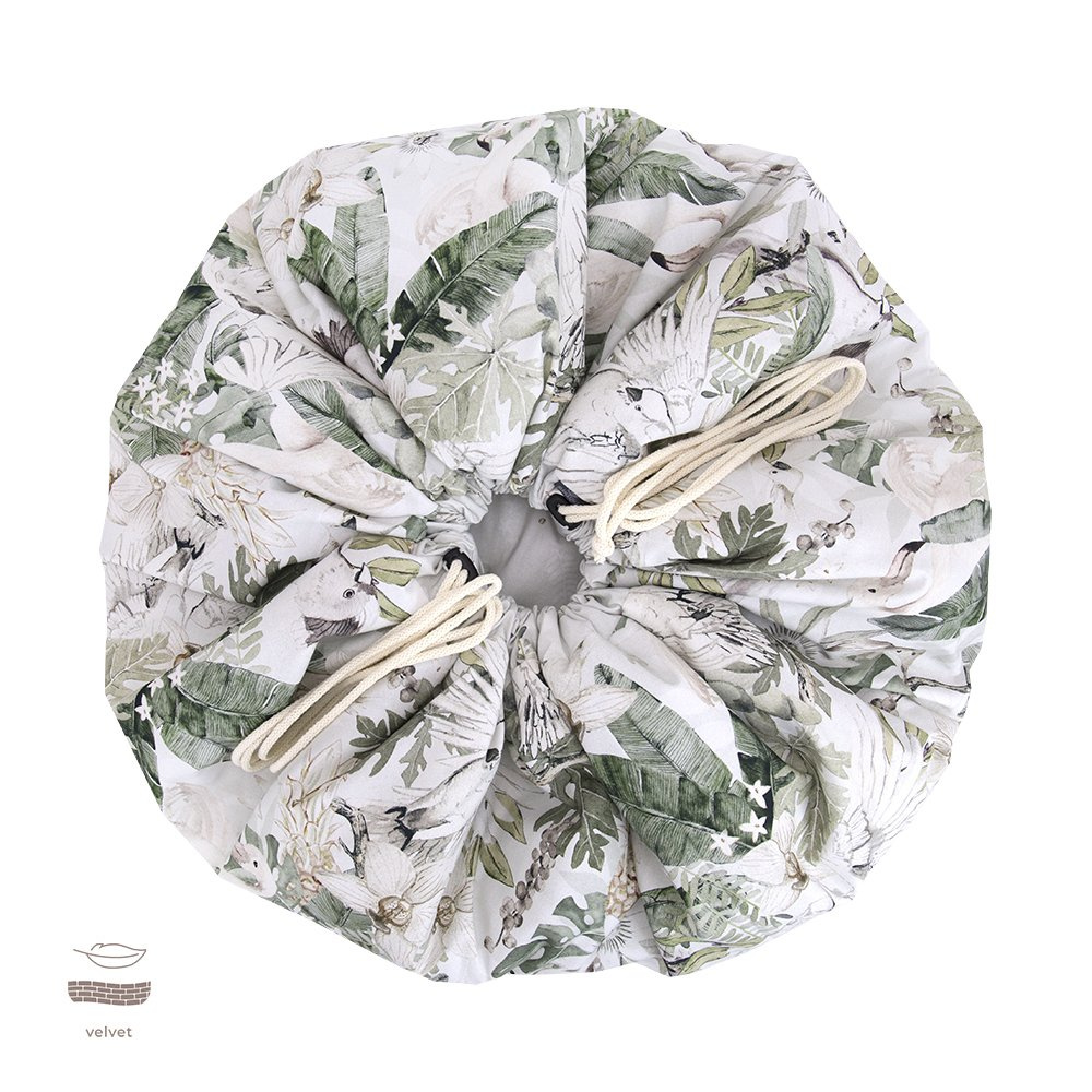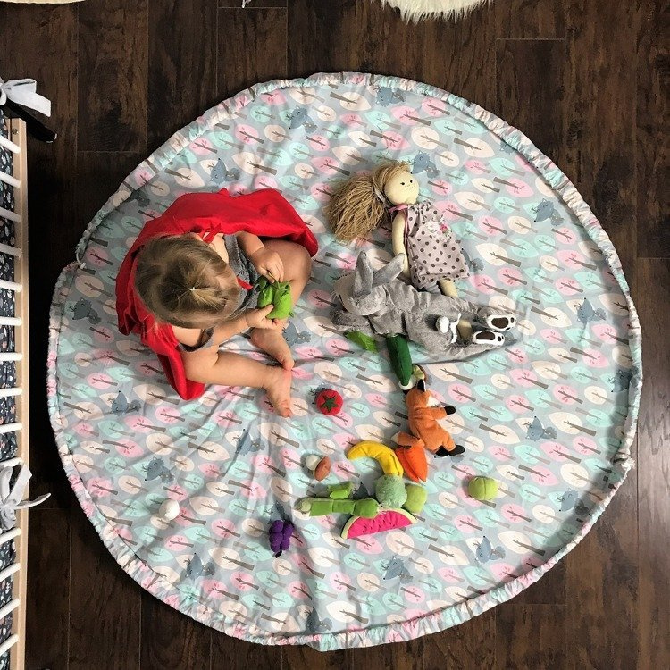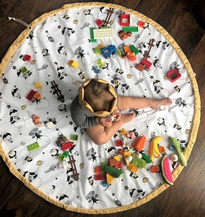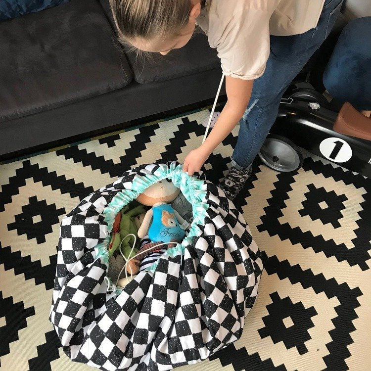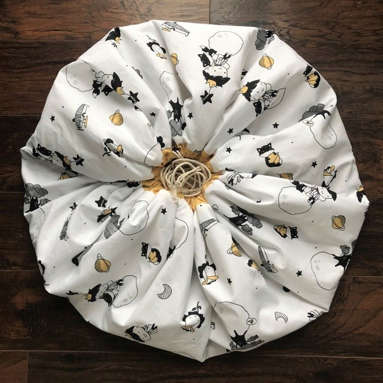 Mata do zabawy została uszyta w taki sposób, aby po zakończonej zabawie zwinąć ją szybko razem z zabawkami i nie martwić się o bałagan. W obwód ma wszyty mocny sznurek, który zaciąga się tworząc z maty duży worek na zabawki.
