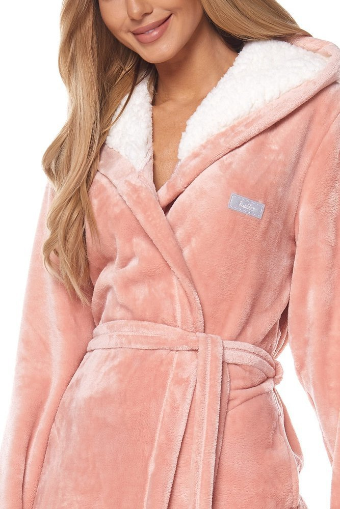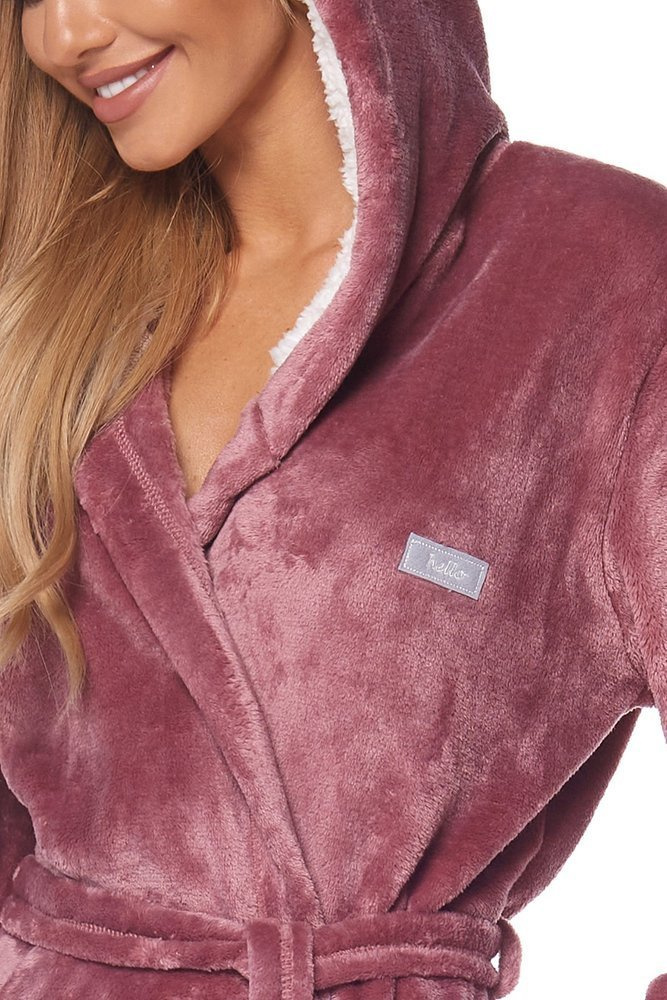 Krótki wygodny szlafrok damski wykonany z miłej, miękkiej dzianiny. Na wysokości klatki piersiowej mała naszywka. Wiązany w pasie z kieszeniami. Kaptur od wewnętrzne strony wyściełany białym futerkiem.