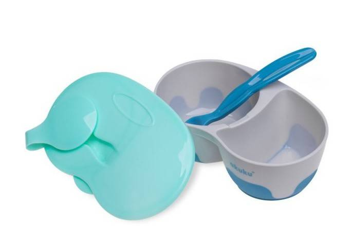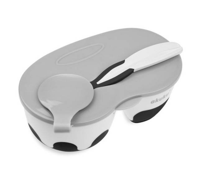Praktyczna miseczka dwukomorowa - produkt przydatny na spacerze lub w podróży. Dwie komory umożliwiają podział posiłków. Pokrywka miseczki posiada specjalne mocowanie na profilowaną łyżeczkę - stanowi ono również osłonkę. Wyposażona w antypoślizgowy spód. Miękka łyżeczka nie podrażni delikatnych dziąseł dziecka. Wielkością i kształtem dopasowana jest do buzi malucha. Wykonana w całości z bezpiecznych materiałów przeznaczonych do kontaktu z żywnością, nie zawiera bisfenolu A (0% BPA). Podczas podgrzewania w mikrofali nie używać pokrywki.
