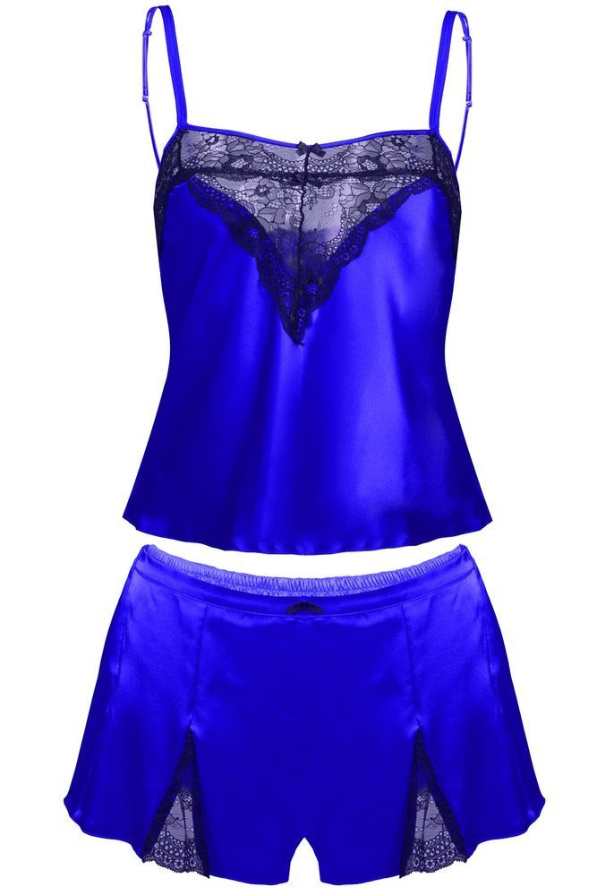 Satynowy komplecik w który skład wchodzi koszulka oraz spodenki. Górę koszulki zdobi delikatna, zmysłowa koronka na dekolcie.