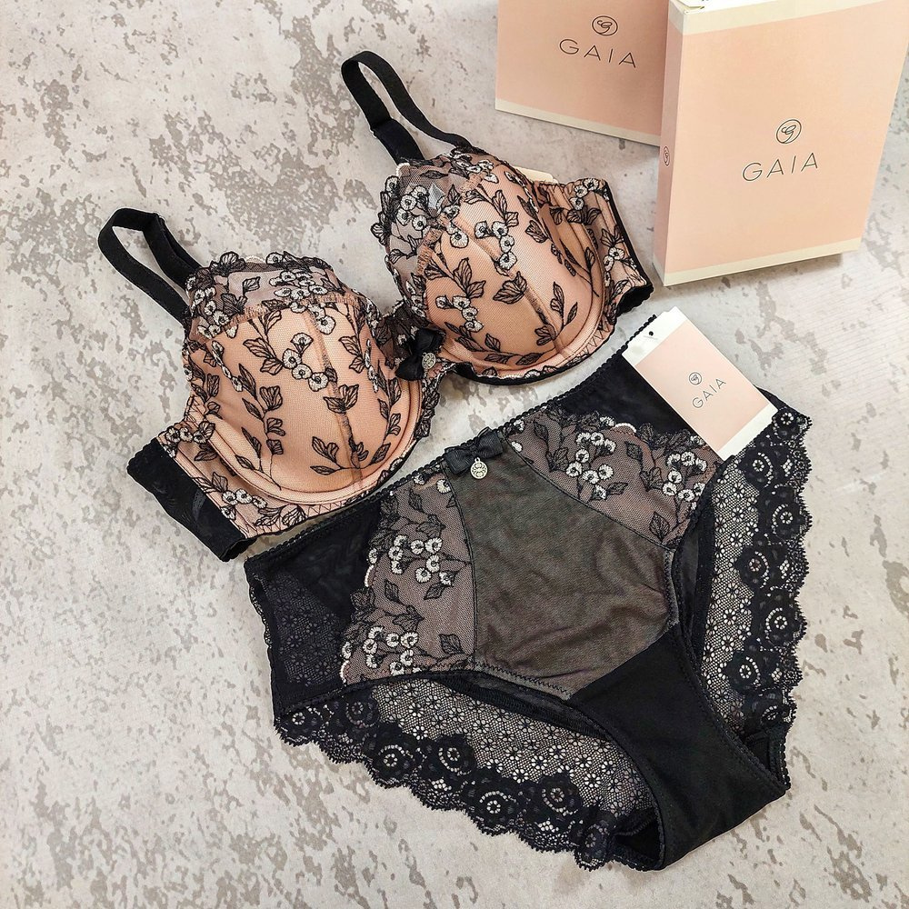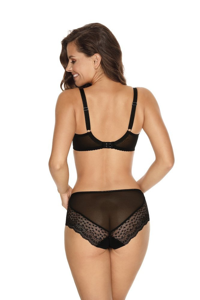 Półusztywniany biustonosz Cherry w kolorach czerni z dodatkiem beżu. Cała miseczka, środek oraz kopytko, uszyte ze stabilnego, czarnego haftu w kwiaty. Plecy odcinane, uszyte z grubego, elastycznego, czarnego tiulu.