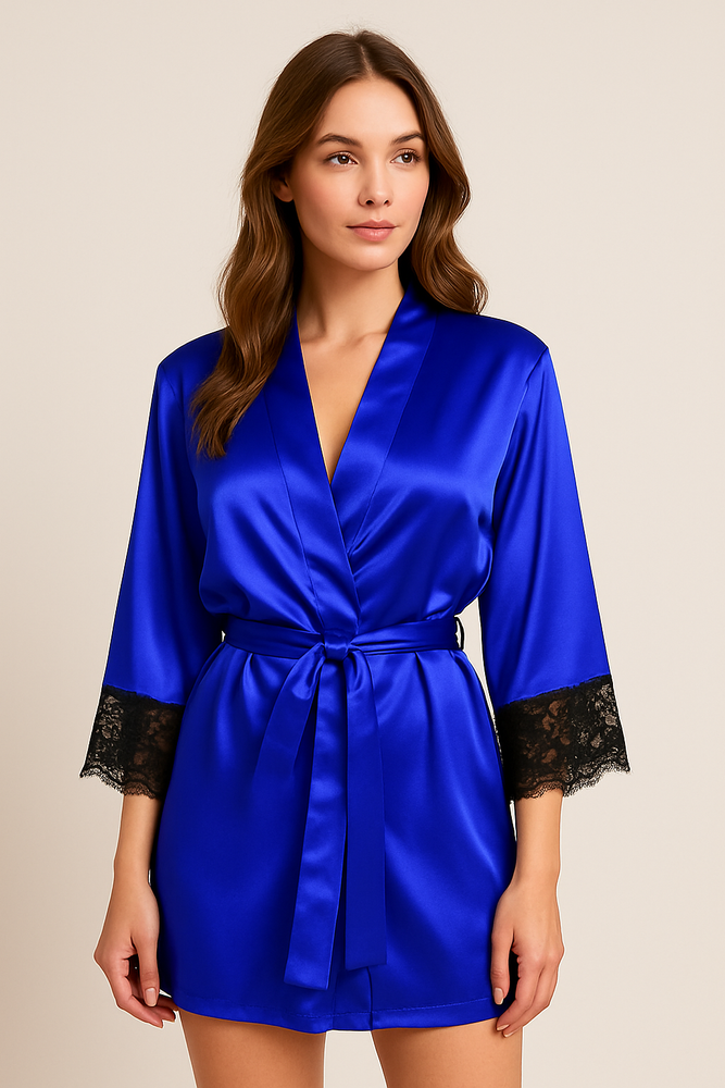 Przyjemny satynowy szlafrok dla każdej kobiety. Długie rękawy wykończone piękną koronką . Przeplatany paskiem satynowym, który idealnie dopasowuje się do sylwetki, uwydatniając atuty kobiecego ciała.