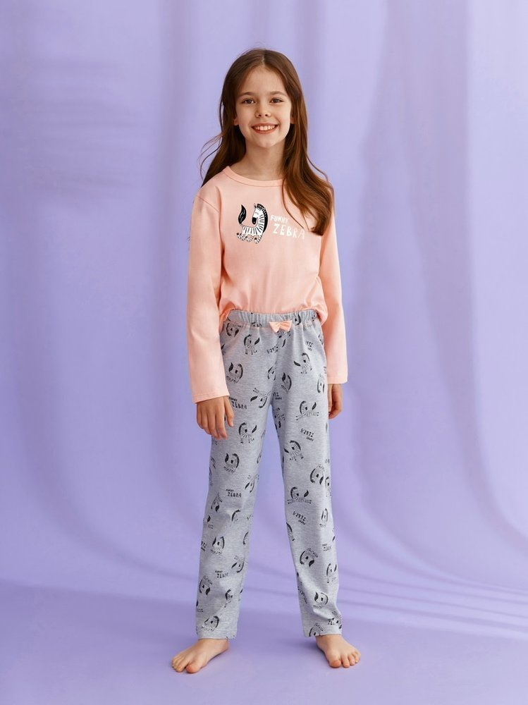 Piżama dziewczęca uszyta z wysokiej jakości bawełny. Koszulka z długim rękawem, przód ozdobiony kolorowym nadrukiem.