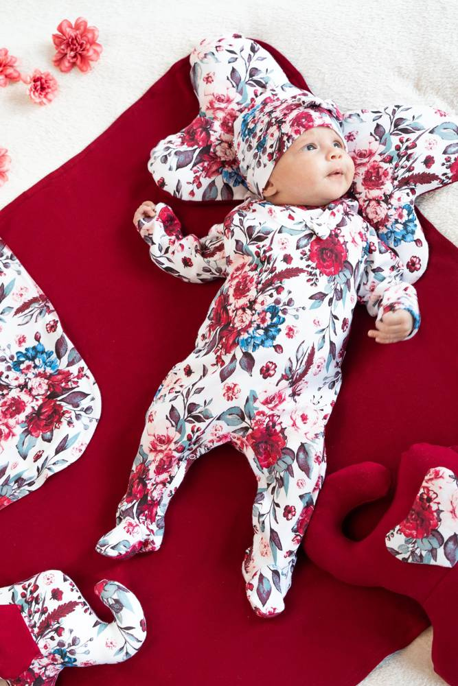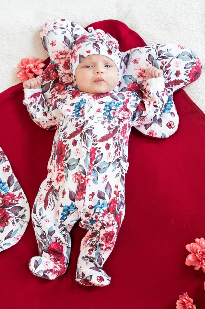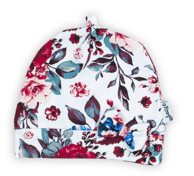 Praktyczna czapka dla dziewczynki, uszyta z wysokogatunkowej, białej bawełny w kwieciste wzorki z dodatkiem elastanu. Został do niej wszyty szeroki ściągacz pod kolor. Materiał posiada certyfikat Oeko-Tex Standard 100 Tekstylia godne zaufania. Produkt zdobi supełek oraz kokardka z przodu.