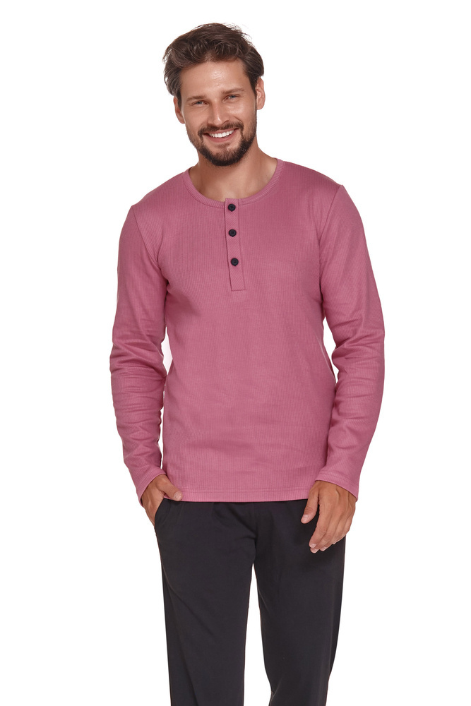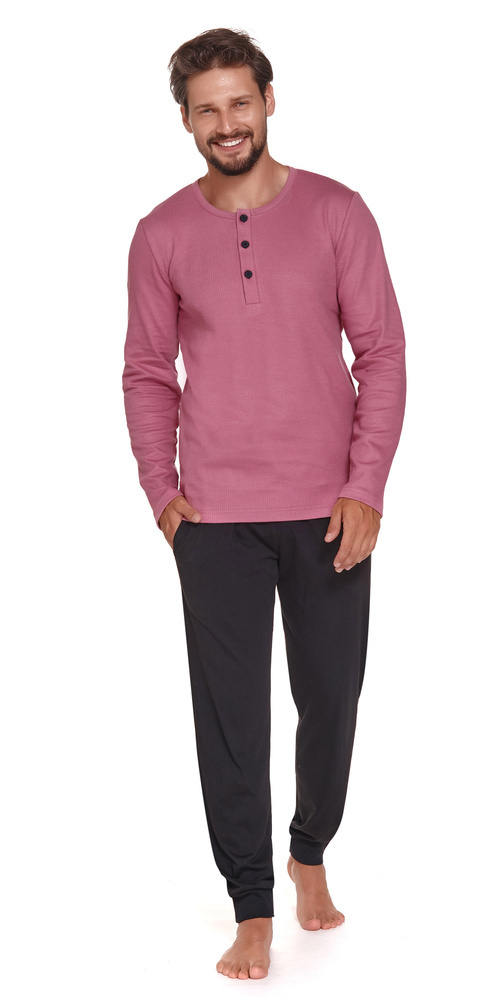 Piżama męska wykonana z wysokiej jakości miłej i miękkiej bawełny. Model o klasycznym kroju. Koszulka z długim rękawem, dekolt półokrągły, z guzikami. Spodnie długie, gładkie, wykończone komfortową gumką w pasie. Nogawki zakończone ściągaczami. Spodoba się najbardziej wymagającym mężczyzną.