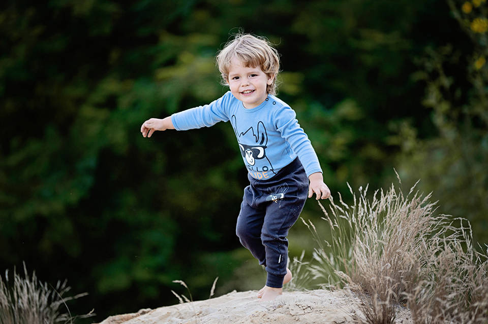 W pasie wszyta jest nieuciskająca gumka, która utrzymuje ubranko na miejscu. Krój zapewnia maluchowi komfort noszenia i nie krępuje ruchów.