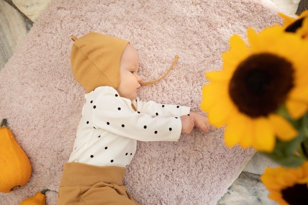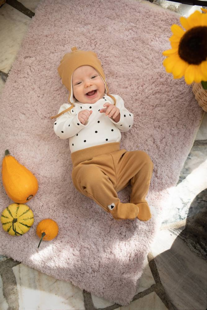 Bawełniana czapka wiązana dobrze przylega do główki, dzięki czemu zapewnia maluchowi ochronę uszu przed chłodem.