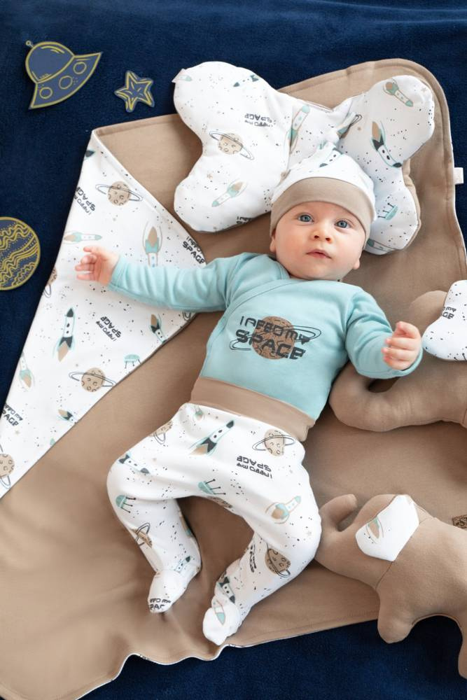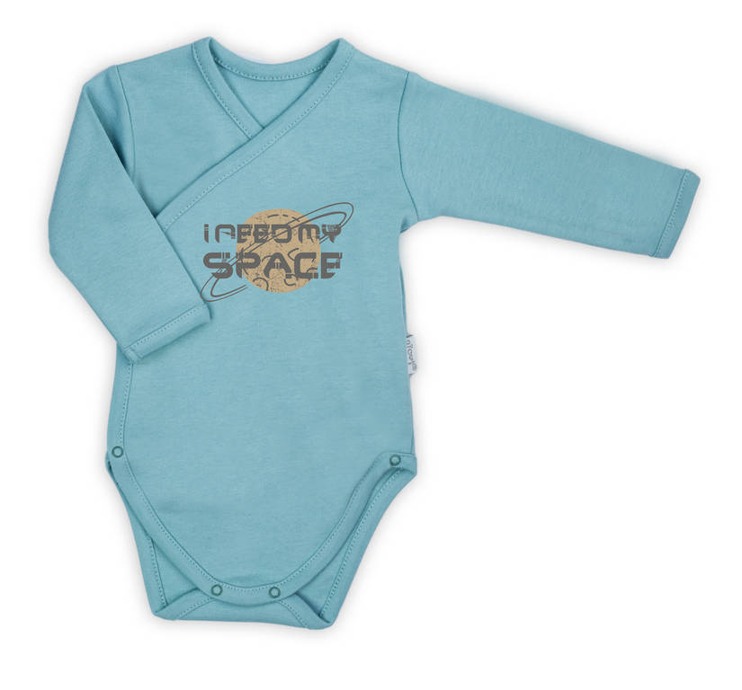 Przewiewne body z długim rękawem, uszyte z białej bawełny z motywem kosmosu, posiadającej certyfikat Oeko-Tex Standard 100 Tekstylia godne zaufania.