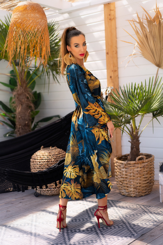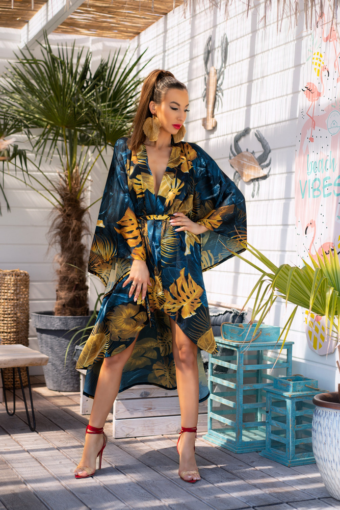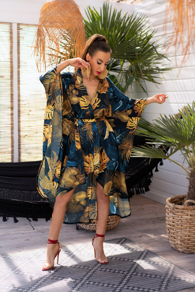 Połączenie subtelnej zmysłowości ze stylową oryginalnością. Wiązany w talii grubą szarfą szlafrok został uszyty z przewiewnej tkaniny. Miękki i miły w dotyku materiał. Czarny materiał został ozdobiony oryginalnym wzorem, przedstawiającym motywy roślinne. Brzegi tkaniny zabezpieczono przed pruciem przez podwinięcie i podszycie materiału, co pozwoliło uzyskać eleganckie wykończenie. Kopertowy krój szlafroka sprawia, że można w prosty sposób regulować głębokość dekoltu. Wygodne, szerokie rękawy nie ograniczają ruchów, co zapewnia komfort i swobodę użytkowania. Szlafrok idealnie prezentuje się na każdym typie sylwetki. Został zaprojektowany tak, by zakrywał niedoskonałości i eksponował atuty figury.
