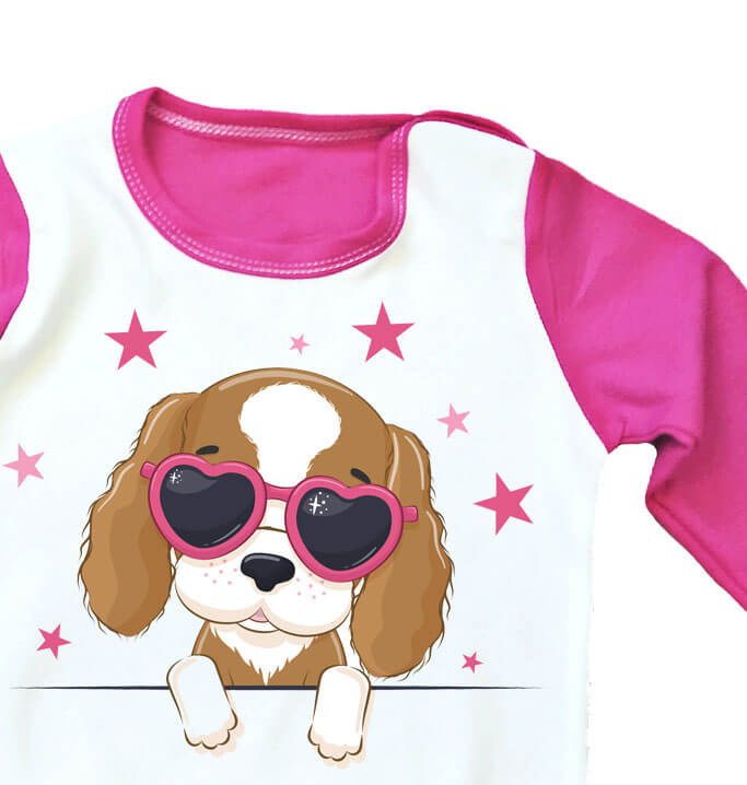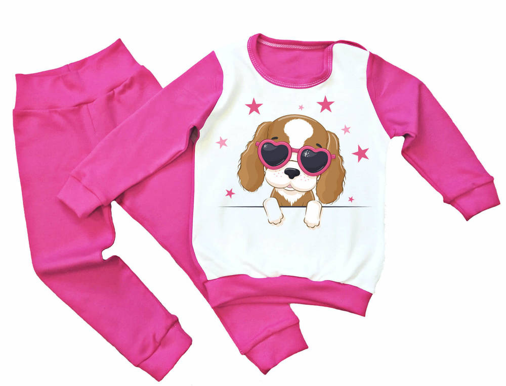 Bawełniana piżamka z pieskiem z luźną bluzką z długim rękawem. Spodnie w posiadają w pasie wygodną gumkę, nie uciskającą brzuszka. Dół nogawek zakończono ściągaczem. Bawełna, z której jest uszyta, posiada certyfikat Oeko-Tex Standard 100 Tekstylia godne zaufania.