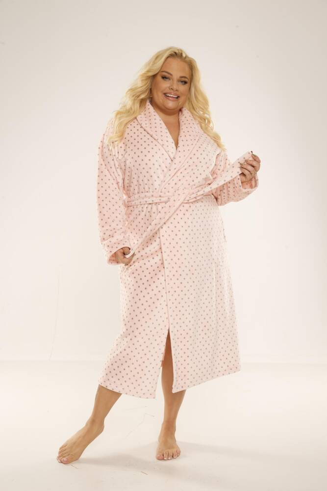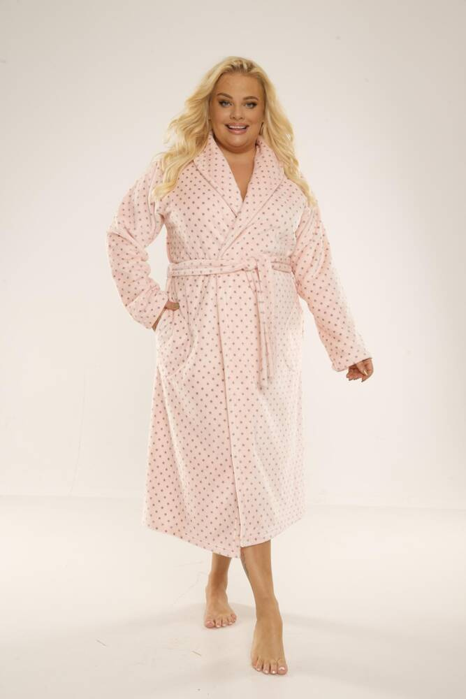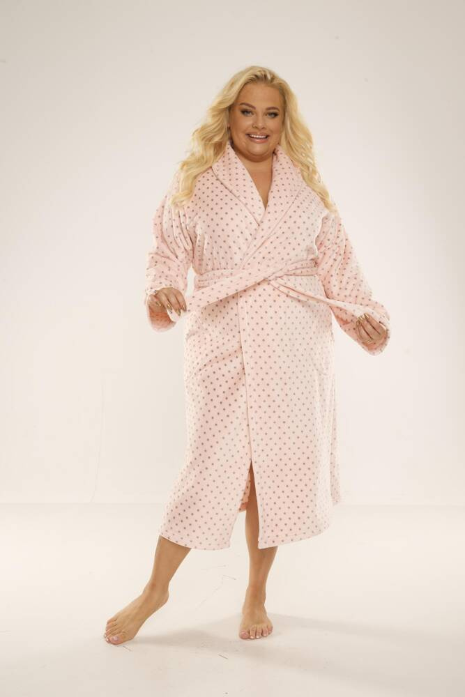 Szlafrok damski firmy FOREX o prostym kroju z kołnierzem. Długość do łydki, po bokach kieszenie, w pasie wiązany na pasek. Całość w groszki. Szlafrok świetnie dopasowuje się do kształtu ciała, jest niezwykle miękki i lekki, wykonany z dzianiny typu soft. Otulenie się nim po kąpieli to sama przyjemność!