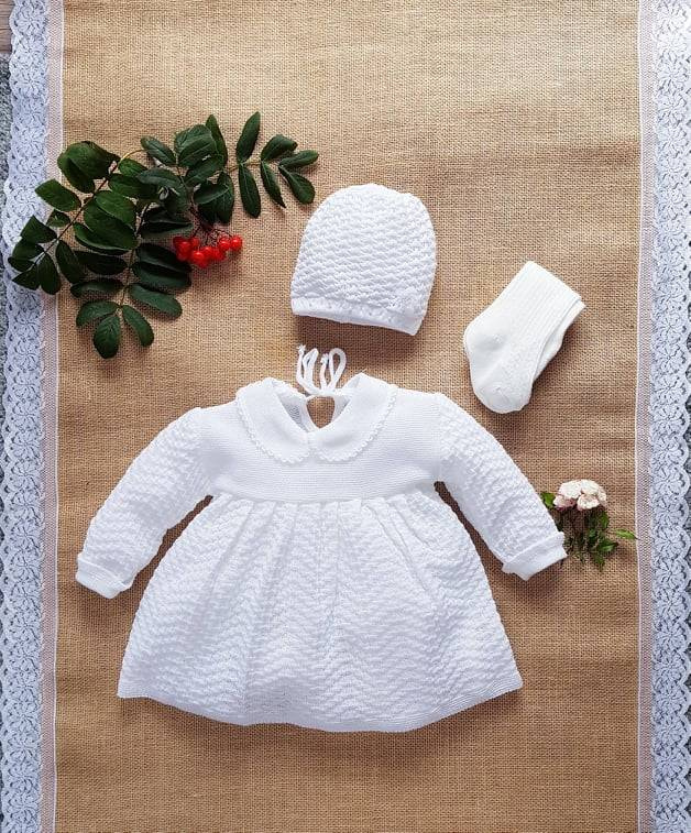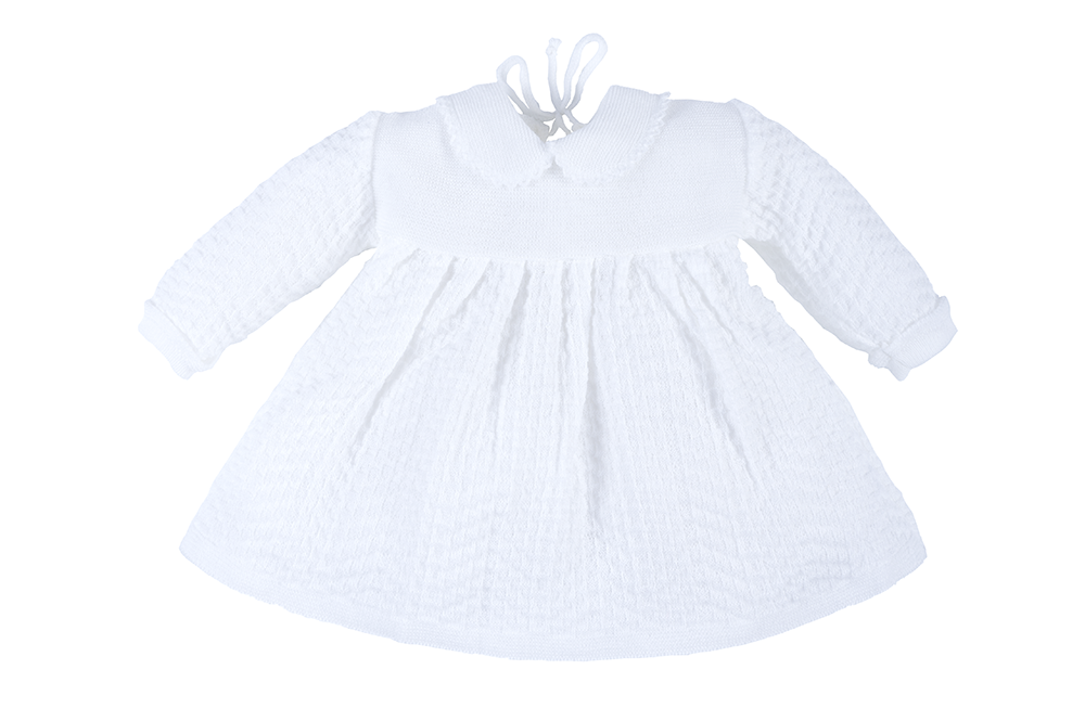 Biała, ażurowa sukienka dla dziewczynki wykonana z bardzo przyjemnej i delikatnej dzianiny. Zapinana z tyłu na sznureczek. Karczek sukieneczki wykonany z gładkiej dzianiny, dół plisowany. Wykończona kołnierzykiem z ozdobnym ściegiem. Rękawki zakończone ozdobnym wywinięciem również z ozdobnym ściegiem. Model ten został stworzony z myślą o wyjątkowych okazjach.