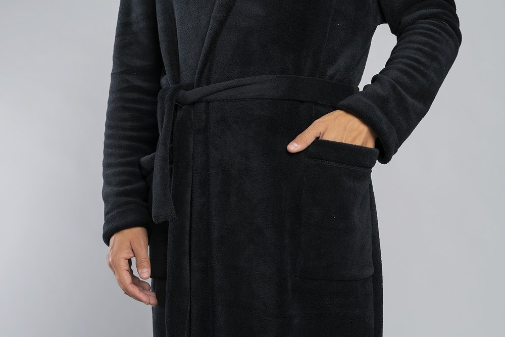 Długi szlafrok męski z kapturem, wiązany w pasie.