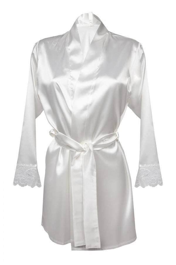 Kusząca, a zarazem elegancka satynowa podomka, która powinna się znaleźć w garderobie każdej kobiety. Rękawy wykończone szeroką koronką, co dodaje lekkości i kobiecości. Szlafrok zalotnie wiązany w pasie. Skład: 100% poliester.