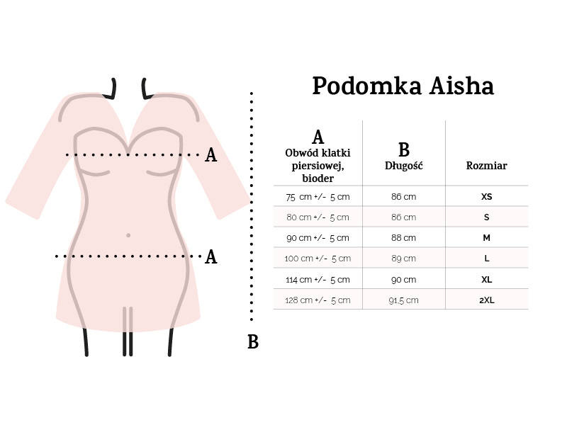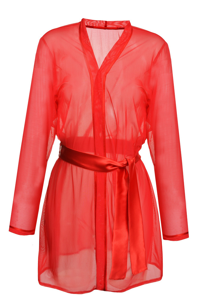Podomka Aisha to z pewnością propozycja dla nieco odważniejszych pań, które nie boją pokazać się czegoś więcej. Tutaj nie trzeba dodawać, że widząc Cię w tej podomce, Twój partner będzie w siódmym niebie. Podomka Aisha wykonana jest z niemal przezroczystego tiulu. Szlafroczek obszyty jest tasiemką. Jego rękawy są długie i luźne. Do podomki dołączony jest satynowy pasek, dzięki któremu można wyeksponować swoje atuty i podkreślić talię. Podomka Aisha dostępna jest w trzech różnych kolorach. Na który się skusisz? Seksowną czerwień, tajemniczą czerń czy delikatną ecru? Wybierz swój ulubiony kolor i spędź upojne chwile ze swoim mężczyzną..