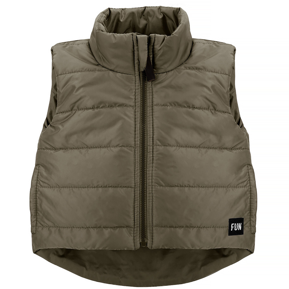 Kamizelka zapinana na zamek. Swobodny krój nie krępuje ruchów malucha i zapewnia mu komfort podczas codziennych aktywności. Kamizelka to idealne ubranko, gdy jest za ciepło na bluzę, a za zimno na samą bluzeczkę