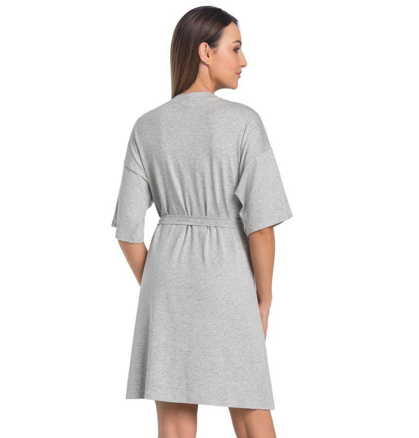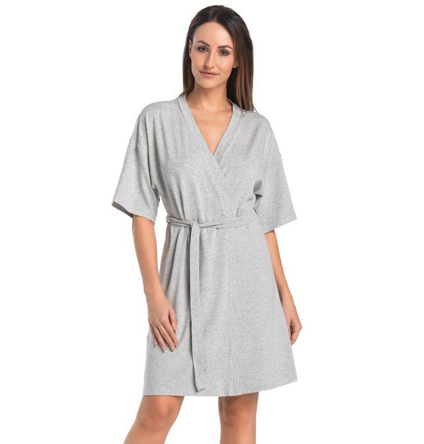 Szlafrok Maddalena jest adresowany do pań kochających prostote i klasykę, minimalizm i komfort. Jest bardzo funkcjonalny w użytkowaniu i bardzo przyjemny w dotyku. Rękaw w szlafroku sięga do łokcia, jest prosto wykończony, jest szerszy, nie opina rąk. Z przodu szlafrok wokół dekoltu zakłada się na krzyż, eksponując dekolt, jest obszyty szerszą listwą. W połączeniu z koszulką nocną wykonaną z tej samej tkaniny i w tym samym kolorze tworzy efektowny zestaw bieliźniany.