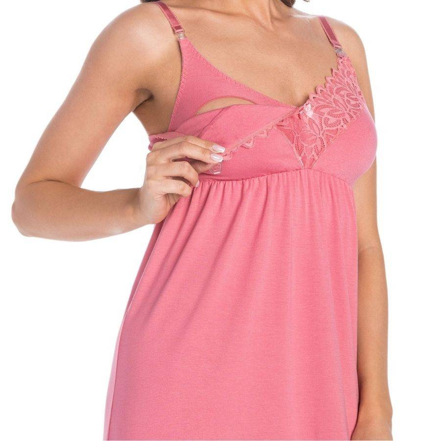 Pod biustem jest odcinana i podszyta cienką elastyczną gumką, która podtrzymuje biust na odpowiedniej wysokości. Z przodu w części miskowej wykończona jest elegancką, elastyczną i miłą w dotyku wzorzystą koronką o motywach kwiatowych. Dzięki odpowiedniemu cięciu i wyprofilowaniu misek dekolt jest ładnie wyeksponowany. Na ramiączkach znajdują się klipsy, które można odpiąć za pomocą jednej ręki i łatwością przystawić malucha do piersi. Od wewnątrz miski podszyte są delikatną przewiewną bawełną. Długość koszuli sięga do połowy uda. Koszula dla mam karmiących poza zaletami kroju i przewiewności jest bardzo efektowna w wyglądzie i każda mama karmiąca bez względu na wiek będzie w niej wyglądać elegancko.