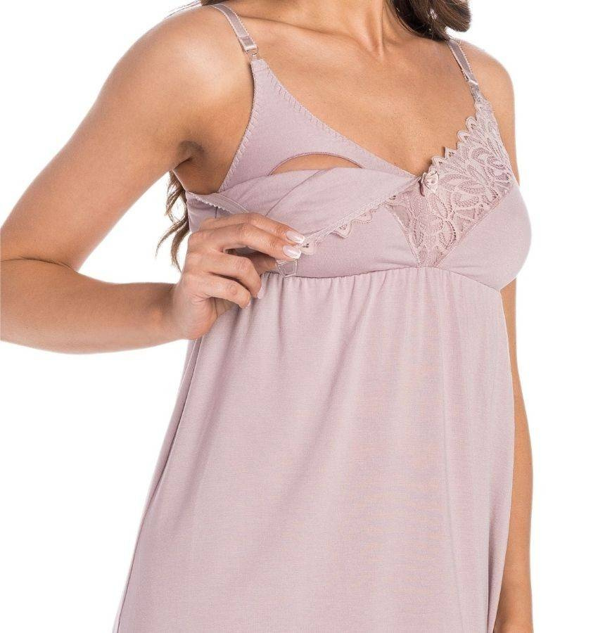 Pod biustem jest odcinana i podszyta cienką elastyczną gumką, która podtrzymuje biust na odpowiedniej wysokości. Z przodu w części miskowej wykończona jest elegancką, elastyczną i miłą w dotyku wzorzystą koronką o motywach kwiatowych. Dzięki odpowiedniemu cięciu i wyprofilowaniu misek dekolt jest ładnie wyeksponowany. Na ramiączkach znajdują się klipsy, które można odpiąć za pomocą jednej ręki i łatwością przystawić malucha do piersi. Od wewnątrz miski podszyte są delikatną przewiewną bawełną. Długość koszuli sięga do połowy uda. Koszula dla mam karmiących poza zaletami kroju i przewiewności jest bardzo efektowna w wyglądzie i każda mama karmiąca bez względu na wiek będzie w niej wyglądać elegancko.