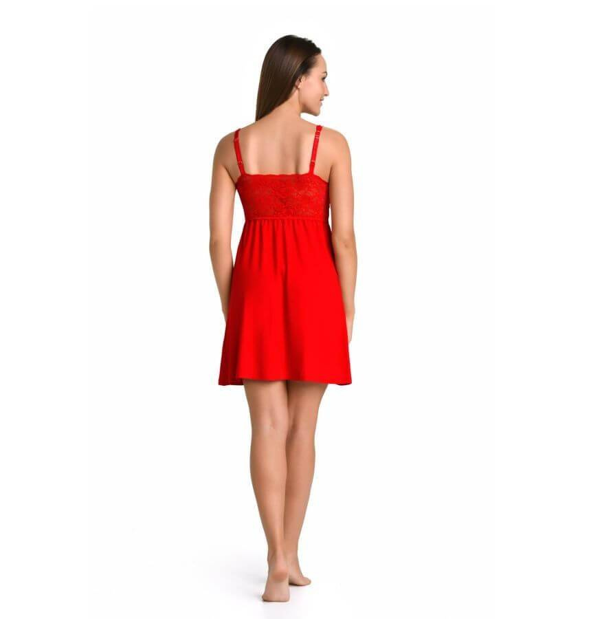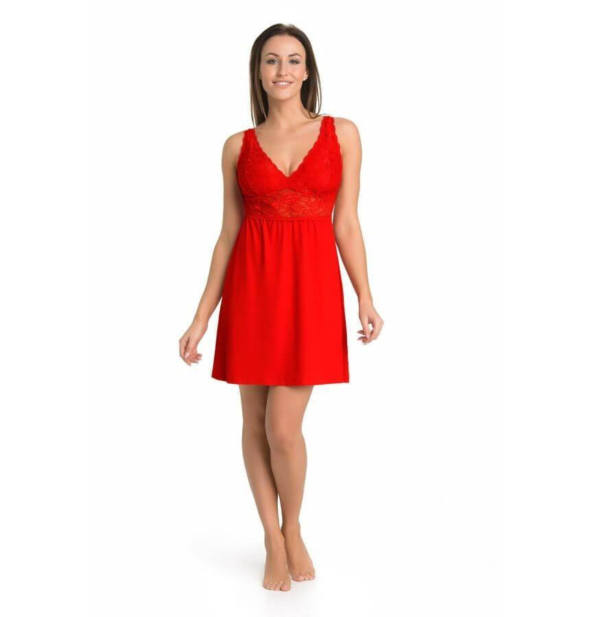 Koszula damska w kolorze czerwonym wykonana jest z wysokogatunkowej wiskozy, dzięki czemu jest bardzo oddychająca i przyjemna dla ciała. Połączona z koronką o drobnym motywie kwiatowym. Odcinane pod biustem miseczki z koronki, podszyte są bawełną, co daje dodatkowe wzmocnienie na biuście, dzięki czemu model ten adresowany jest również do Pań z większym biustem.