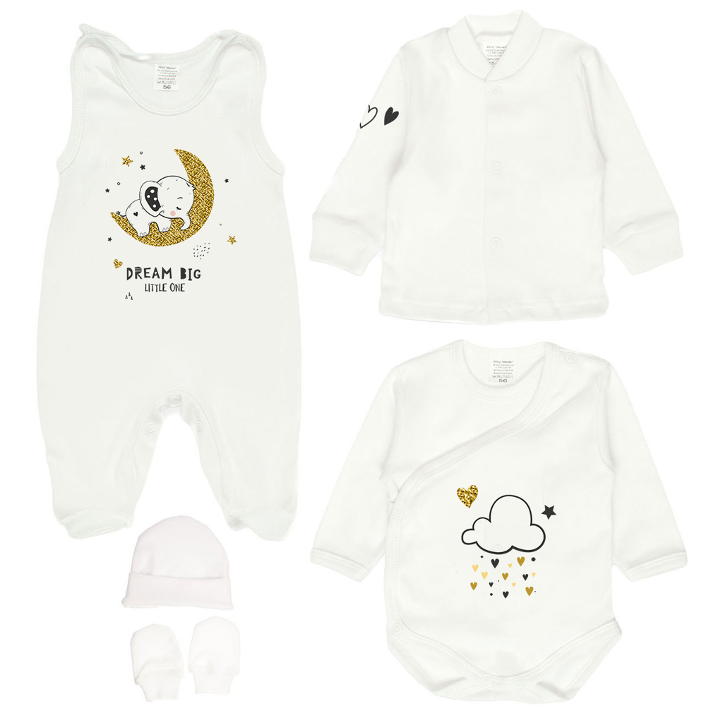 Zestaw niemowlęcy, który składa się z bodów kopertowych, bardzo praktycznych dla noworodka, kaftanika, śpioszków,czapeczki i łapek. Nadruk wykonano bezpieczną metodą farb wodnych. Zatrzaski wykonano z antyalergicznego, bezniklowego tworzywa.