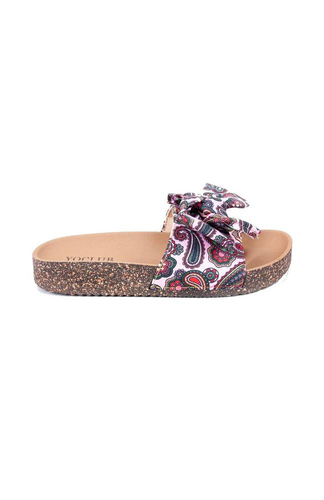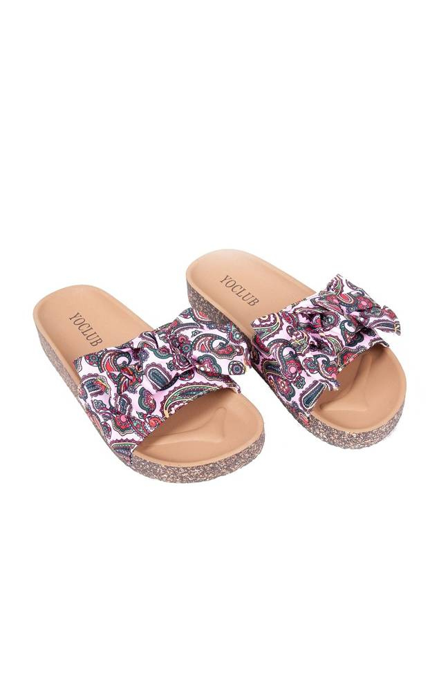 Klapki/Kapcie damskie z wzorzystą ozdobną kokardką