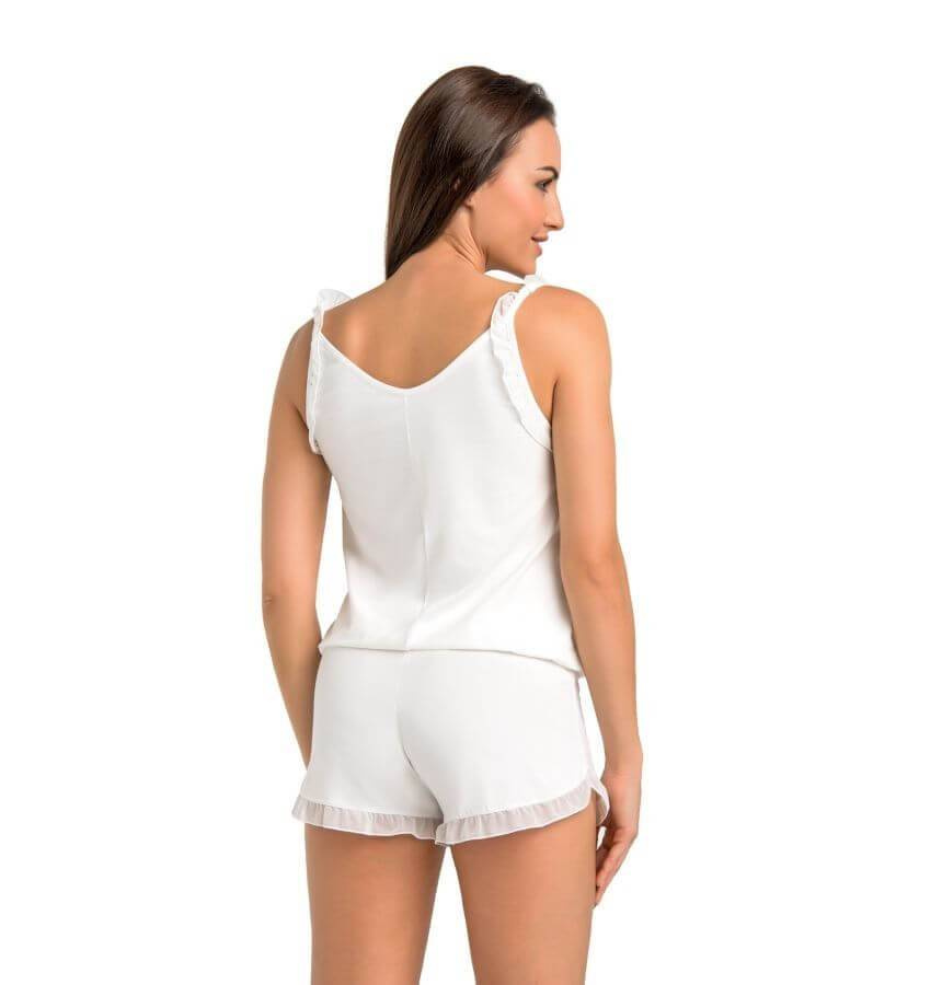 Top bardzo dobrze się układa, opadając na biodra. Model luźny, wygodny do spania, posiada półokrągły dekolt. Szorty z delikatną i komfortową gumką, dołem wykończone falbanką, wygodne, seksowne, a zarazem podkreślające kształty pupy.