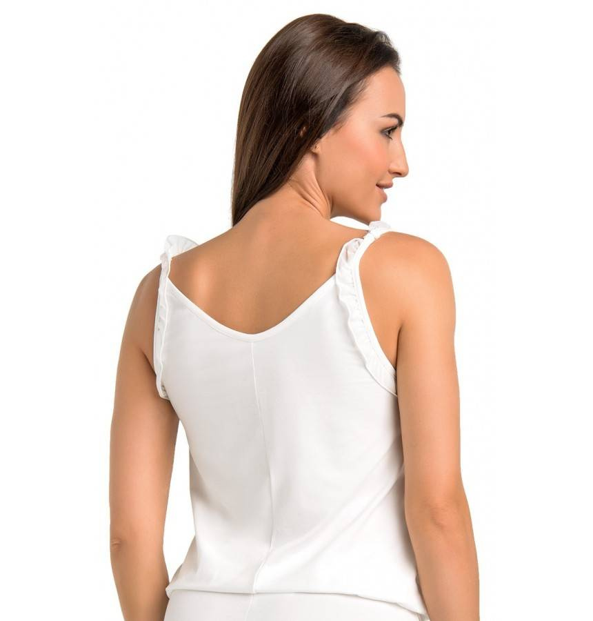 Koszulka wykonana jest wykonana z wysokiej jakości tkaniny. Koło szyi wykończona jest na półokrągło, na cienkich ramiączkach ozdobionych falbanką, dołem natomiast szerszą listwą. Jest luźniejsza i nie przylega do ciała, dzięki czemu doskonale kryje niedoskonałości.