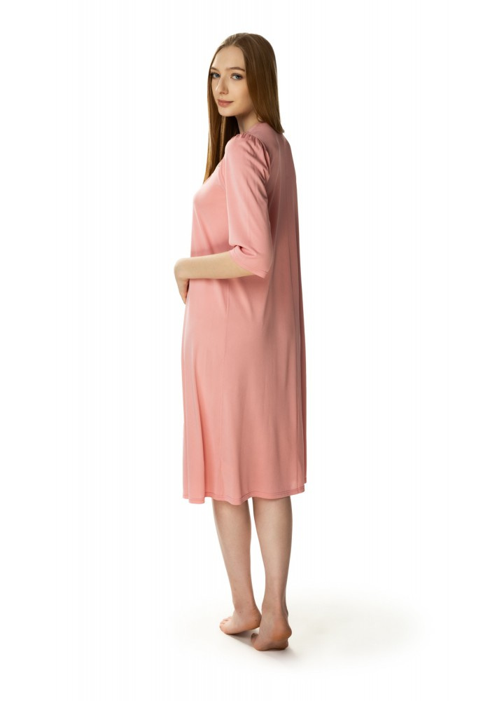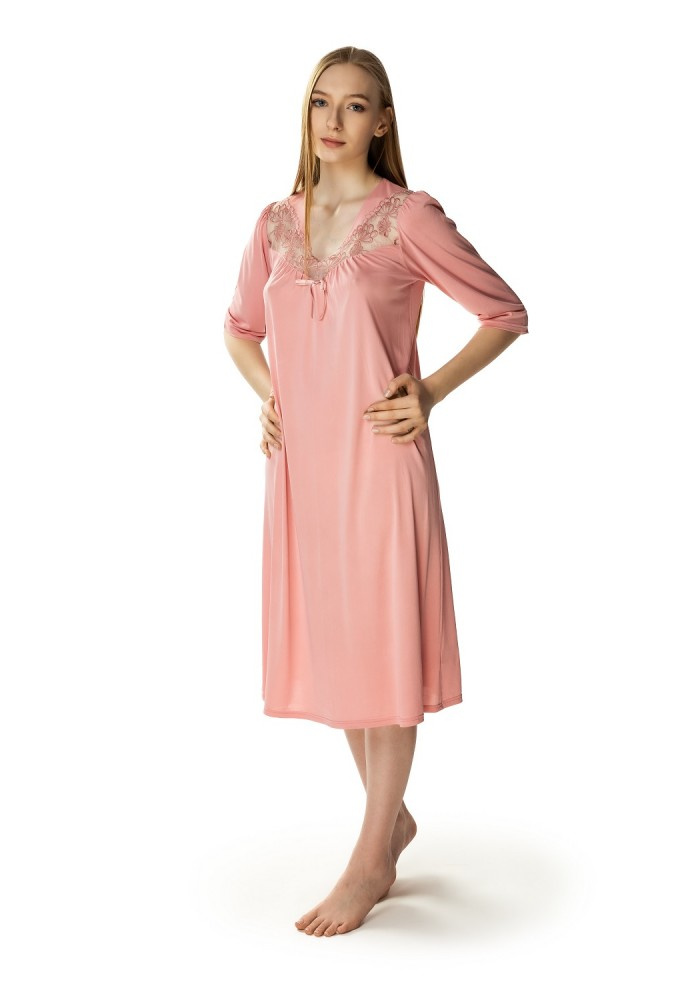 Model Diana posiada długość "za kolano" oraz wygodny rękaw 3/4. Dekolt został ozdobiony uroczą koronką oraz małą tekstylną kokardką. Luźny, zwiewny fason pozwala na dużą swobodę ruchów. Z pewnością spodoba się także Paniom plus size.