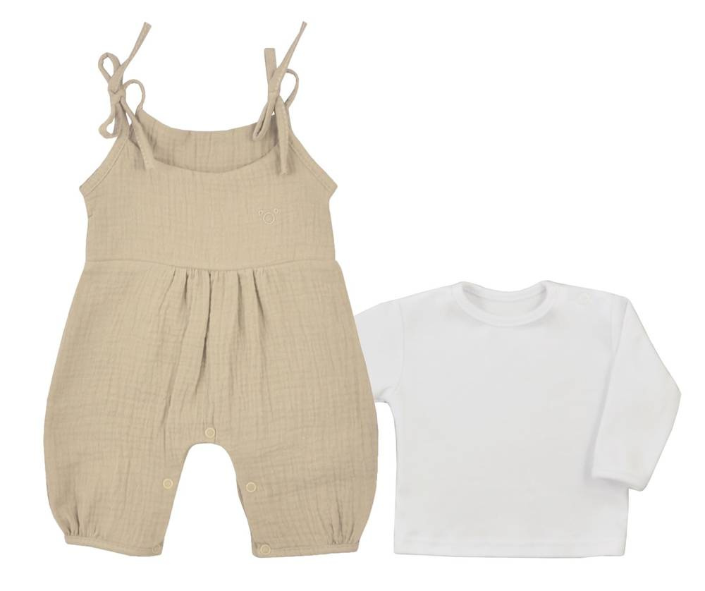 Zestaw niemowlęcy, który składa się z spodenek i koszulki.